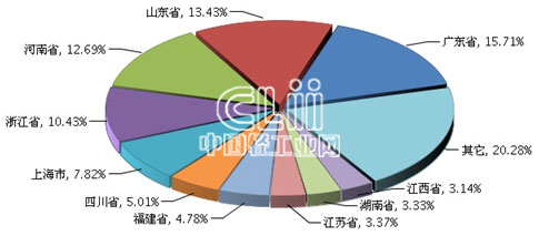 1~10月,家具行业累计利润额居全国前十的地区依次是广东、山东、河南、浙江、上海、四川、福建、江苏、湖南及江西;与1~9月相比,江苏超越湖南,成为了第八位,安徽跌出前十,由江西替代第十位。其中,广东累计实现利润总额(下同)占15.71%,山东占13.43%,河南占12.69%,浙江占10.43%,上海占7.82%,四川占5.01%,福建占4.78%,江苏占3.37%,湖南占3.33%,江西占3.14%(图6)。