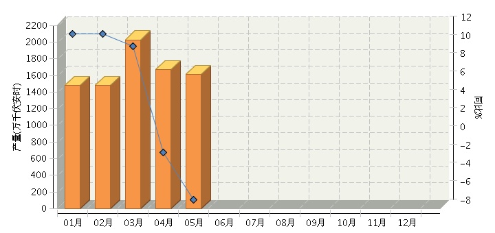 根据国家统计局公布数据,2016年1~5月全国铅酸蓄电池行业累计完成产量同比增长5.38%。其中:5月份完成产量同比增长-7.06%。2016年全国铅酸蓄电池行业月度产量及同比如下图所示。