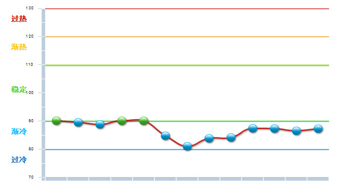 自15年9月中轻指数下降到渐冷区域运行虽然有所回升但还没有达到稳定区域。(参见图2)