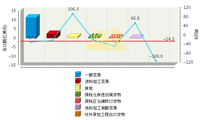 从贸易方式分布看,一般贸易完成累计出口额11.12亿美元(占76%),同比增长-17.93%;进料加工贸易完成累计出口额2.16亿美元(占14.73%),同比增长-10.73%;其他完成累计出口额0.75亿美元(占5.11%),同比增长106.34%;保税仓库进出境货物完成累计出口额0.37亿美元(占2.5%),同比增长-8.79%;保税区仓储转口货物完成累计出口额0.22亿美元(占1.5%),同比增长-34.92%;来料加工装配贸易完成累计出口额0.02亿美元(占0.17%),同比增长66.81%。