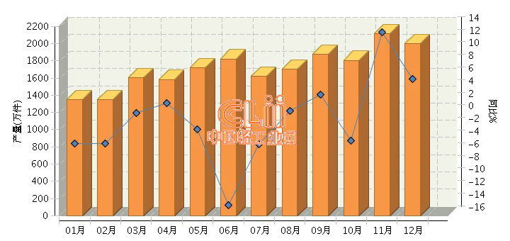 据国家统计局数据显示,2016年1~12月,全国规模以上企业累计生产卫生陶瓷2.08亿件,同比增长5.06%。其中:12月份完成产量2000.52万件,同比增长5.62%。