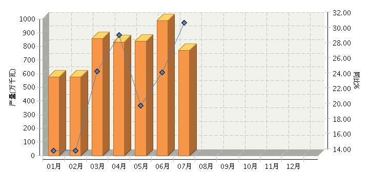 根据国家统计局公布数据,2017年1~7月,全国太阳能电池行业累计完成产量同比增长23.65%。7月份完成产量同比增长31.48%。2017年全国太阳能电池行业月度产量及同比如下图所示。