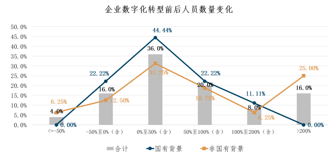 注:折线分别表示两类企业转型前后人员数量变动情况的占比分布,比如,非国有背景企业中有31.25%的企业转型后人员增长在0%-50%(含)的区间。