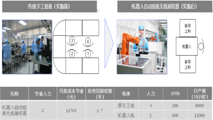 高效是所有企业追求的目标,它和低成本紧密联系在一起。自动线、机器人等技术是实现高效的常用方式。以雷柏公司为例,他们通过标准化无线键鼠生产过程用到的电子元器件的托盘,按固定位置存放不同种类、不同形状电子元器件,固化了用工业机器人抓取电子元器件的动作,为不同生产线模块化且柔性生产提供了可能性。他们用机器人替代无线接收器的传统组装,降低了人工之不良因素,确保效率和品质的提升,其实施效果如图1所示。也就是说雷柏通过应用机器人等自动化和智能技术,使无线键鼠生产过程进化,达到了提高效率的目的。