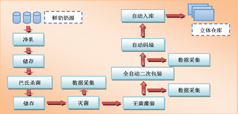 (2)利用数字化技术进行工艺控制。生产线中工艺过程的监控需要利用数字化、传感等技术。例如伊利液态奶数字化工厂,实现了从收奶到产品入/出库所有环节由中央控制系统控制。具体的生产工艺流程如下:收奶系统(原奶过磅→原奶检验→过滤→储存)→标准化系统(净乳→标准化→巴氏杀菌→储存)→超高温(UHT)灭菌工艺段(脱气→均质→预保温→超高温UHT灭菌)→无菌输送→无菌灌装→喷码→全自动二次包装(贴管→装箱)→码垛→检测合格→出厂”,如图10所示。