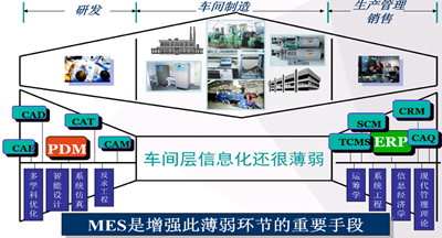 企业的目标,如效率、成本、质量、绿色等都应该落实在车间,智能制造自然也应该落实到车间。车间是制造生产的关键环节,工艺、生产计划调度、物料配送、质量控制等任何一个环节足以影响全局。一般而言,在车间生产过程控制中,MES(制造执行系统)起着关键作用。很多企业在数字化转型过程中往往首先关注产品开发以及生产管理销售,而车间的信息化却很薄弱,如图14所示。但缺少中间环节的数字化支撑,即使有一个功能强大的ERP系统,也不可能真正发挥作用。