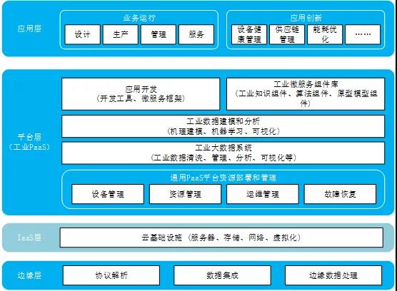 工业互联网平台的核心是平台。传统的工业生产中,通常是人基于感知到的信息,通过数学原理、物理约束、历史经验等总结、推理,最终形成一系列的决策规则和方法,用来指导生产过程。而进入物联网时代以来,极大的扩展了生产要素分布的层次和广度,生产要素之间的联系纷繁复杂,难以用简单的数学或者物理模型进行描述,而对于新模式的生产场景和个性化的生产需求,难以显性、直接地从历史经验中总结出决策规则,因此,工业互联网平台的核心是利用大数据、人工智能等方法,从海量高维、互联互通的工业数据中,挖掘出隐藏的决策规则,从而指导生产。工业互联网平台在通用PaaS架构上进行二次开发,实现工业PaaS层的构建,为工业用户提供海量工业数据的管理和分析服务,并能够积累沉淀不同行业。不同领域内技术、知识、经验等资源,实现封装、固化和复用,在开放的开发环境中以工业微服务的形式提供给开发者,快速构建定制化工业APP,打造完整、开放的工业操作系统。