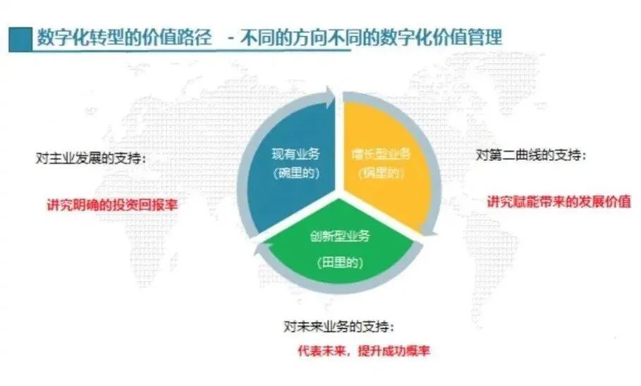 管理数字化转型三个不同类型的使命,对应三个业务领域,不同的方向对应不同的数字化价值管理。