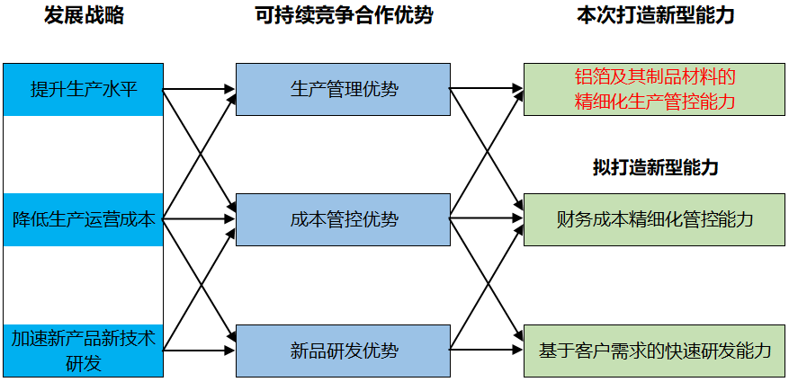 基于此,鼎胜新能源识别并拟打造的新型能力体系包含几个方面:铝箔及其制品材料的精细化生产管控能力、财务成本精细化管控能力、基于客户需求的快速研发能力。