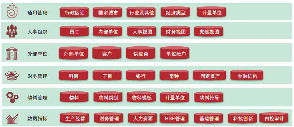 (2)设计了统一的主数据标准,包括通用基础类、内部单位类、外部单位类、物料类、项目类等9大类通用主数据标准,以及各板块专业主数据标准。