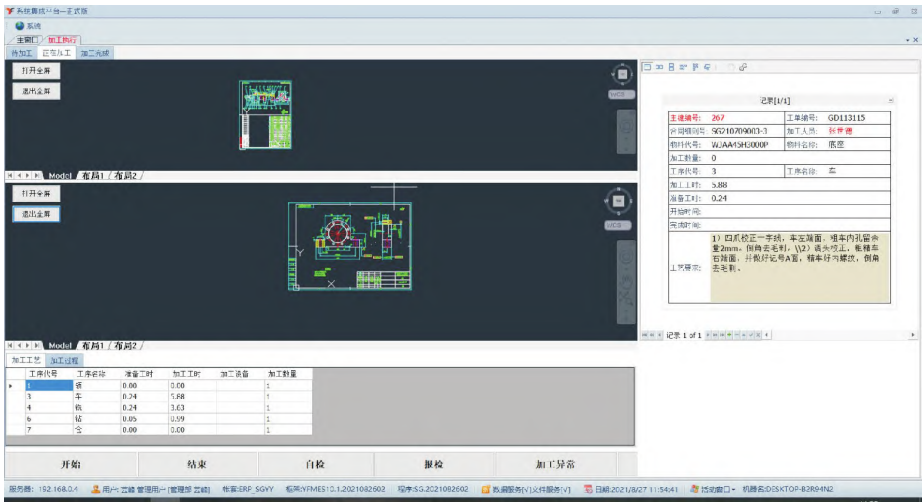 车间的生产难以直接反馈到管理层,零件加工出现问题时难以追溯到上游过程,因此如图9所示通过SCADA系统和对设备的集成,进行现场加工数据的采集和加工执行的监控。并通过MES进行车间现场的维护,结合企业对车间生产信息可视化管控的需求,系统生成零件的单件标识号,采用车间现场的工序报工等方式,进行工序级别的管理。如图10所示,通过将单件标识号、产品图号以及工艺编号的绑定,向加工人员展示其所需的产品和零件图纸以及工艺信息。加工人员通过此模块快速完成向上层的任务反馈和异常状况,并且及时地向下层的质量管理部门传递检验需求,极大地提升了信息的传递速度。