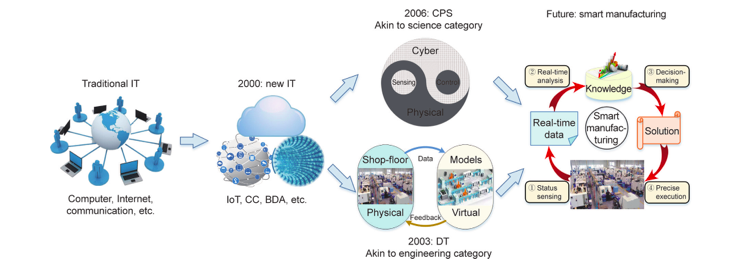 如图1所示,随着传统IT向新一代信息技术(New IT)的演进,New IT的低成本和先进功能对CPS和DT的出现和使用起到了重要促进作用。作为信息物理融合的首选方式,CPS和DT为智能制造的实施提供有效手段,能够从根本上改变现有的制造系统和业务模式。