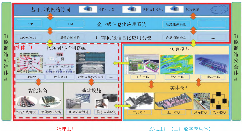 智能工厂建设到底包括哪些内容?怎么建?在新编制的国标里对智能工厂架构的每一项具体内容都进行了详细梳理和定义。智能工厂包括物理工厂和虚拟工厂两部分:智能工厂总体架构以智能制造标准体系和安全体系为两翼,其中物理工厂包括实体工厂、工厂物联网和信息化系统;虚拟工厂包括与实体工厂一一映射的三维信息模型和赋予逻辑算法的仿真模型。物理工厂和虚拟工厂通过数字孪生技术进行连接,最终达到虚实集成。智能工厂架构如图2所示。
