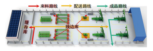 数字车间建设主要围绕工艺流程、生产装备、生产效率、物流效率等方面开展。针对制造过程、检验过程和测试过程,合理优化工艺流程,均衡各工位生产节拍。开展生产装备自动化建设,通过给各工位配备自动化工装和设备,提升装备专业化水准,实现各工位的效率提升。以智能、柔性生产线为依托,根据订单切换产能和节拍,满足雷达小批量、多品种、变节拍生产需求。车间设置缓存库和线边库,整个生产物流形成“缓存库–线边库–工位”三级物料配送模式,通过自动导引车(AGV)、电动叉车进行物料周转与配送。车间内物流路线主要以直线物流为主,简洁高效。