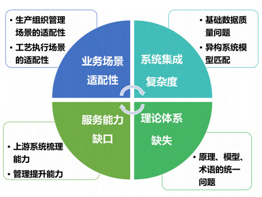 (1)在MOM系统研发方面,难以形成对不同生产组织模式及工艺类型均能够高度适配的平台化产品,即平台化产品的研发难度很高;(2)在系统实施应用方面,难以与企业流程上游的信息系统及下游的设备产生顺畅而有效的数据交互,导致其运行不畅,而这背后则是对MOM从业人员服务能力和用户企业基础数据提升的要求;(3)在知识传播方面,缺少理论体系的支撑,导致行业从业人员及用户对MOM难以形成共识,从而导致行业人才的培养以及对MOM的学习、掌握、应用存在一定困难;(4)MOM作为智能工厂的核心系统,其上游关联经营管理、设计工艺、供应链等多个业务域,且MOM的成功实施往往需要对上游业务系统存在的问题进行梳理和解决,因此对实施人员的能力要求较高,但目前行业从业人员的水平与用户对服务能力的需求存在差距,无法满足行业快速发展的需求。