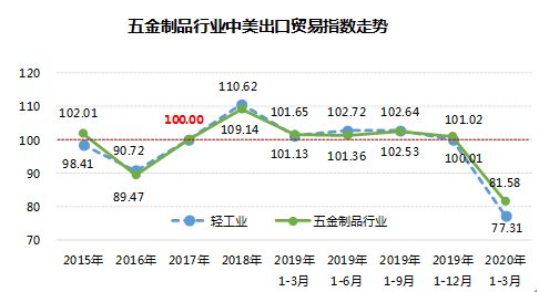 2020年1-3月五金制品行业中美出口贸易指数81.58