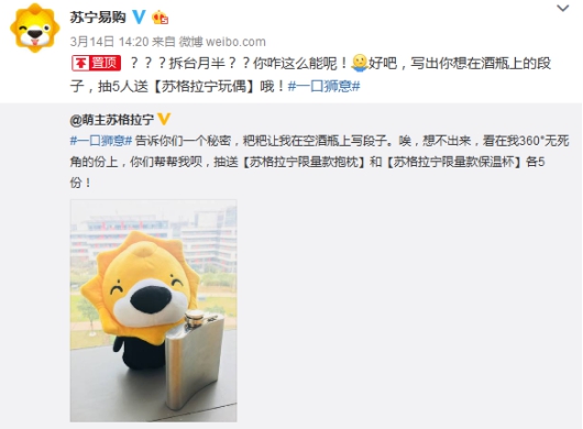 苏宁与凤凰的跨界,源于一次趣味横生的段子征集活动。3月14日,苏宁易购官方微博与苏宁易购吉祥物小狮子的微博账号“萌主苏格拉宁”双双发布内容,向网友征集写到酒瓶上去的段子,引发行业猜测及众段子手围观。