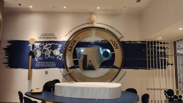 在Lavazza特有的Coffee Design 柜台旁边的墙上装饰着Lavazza定义的咖啡风味轮。在Lavazza看来,纯正的意大利咖啡要在“气味”(Aroma),醇度(Body)和风味(Taste)之间取得美妙的平衡。在上海的旗舰店里,消费者可以在Lavazza最经典的三个咖啡豆产品中探寻自己最爱的咖啡风味。