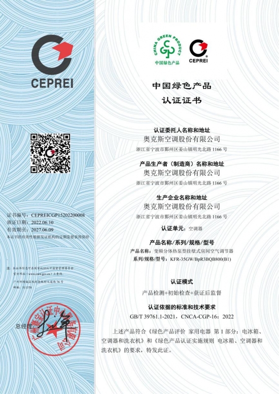 助力绿色低碳发展 奥克斯空调成首批“中国绿色产品认证”家电企业之一