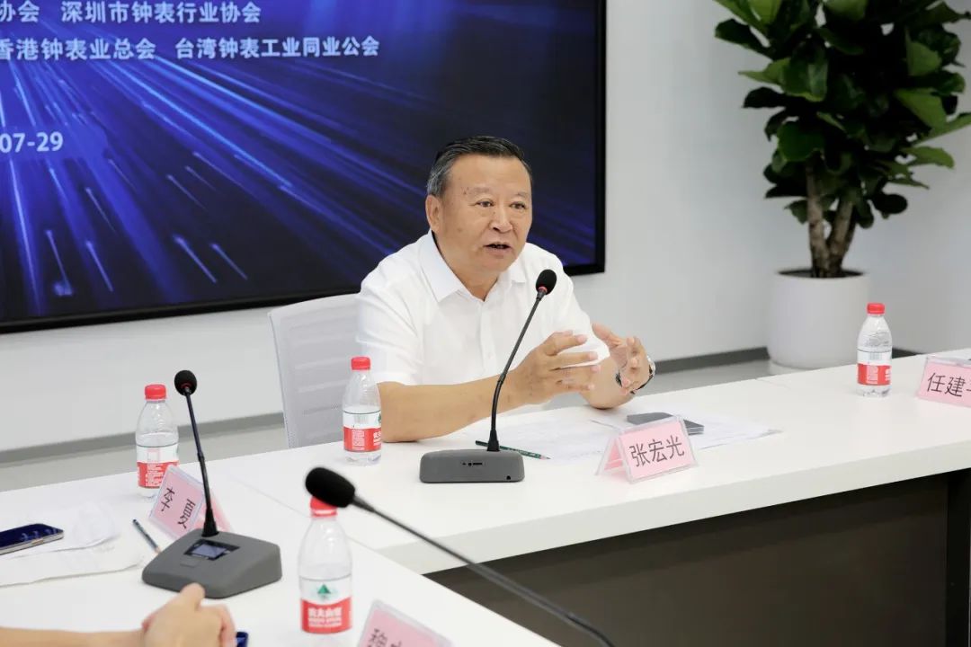 中国钟表协会理事长张宏光参加会议并讲话。中国钟表协会副理事长任建平、高级顾问汪孟晋,孔雀表业(集团)有限公司联席董事长侯桂林、吴建杰,高级副总裁杨威,广东省钟表行业协会会长吴伟阳及其团队、深圳市钟表行业协会副秘书长费勤勇,澳门钟表协会理事长方荣毅及其团队、香港钟表业总会团队,台湾钟表工业同业公会团队,上海汉辰表业集团有限公司总裁徐创越及其旗下的上海表业有限公司和天津海鸥表业集团有限公司的代表,以及来自烟台北极星钟表(集团)有限公司、豪法表业、一豪钟表有限公司、深圳穿金戴银科技股份有限 公司和孔雀表业(集团)深圳公司的嘉宾领导共计53人参加了研讨。研讨会由中国钟表协会秘书长李夏主持。