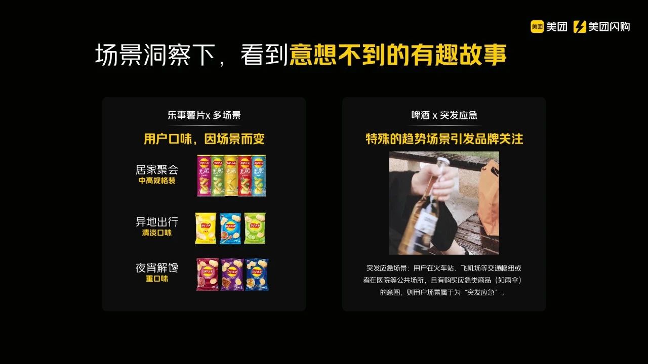 场景营销为何在美团具备独特优势?因为美团的生态系统和场景中涵盖了多种本身就有的业态。例如,我们与酒旅行业有深度合作,酒类订单增长显著,因此在用户出行场景中,我们能够巧妙地推荐相关品类。这正是美团场景营销的核心所在。