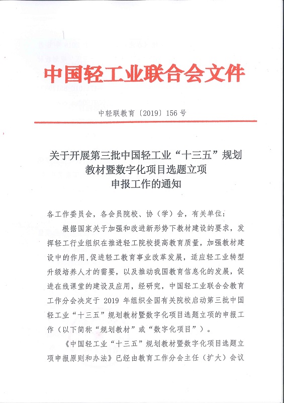 关于开展第三批中国轻工业“十三五”规划教材 暨数字化项目选题立项申报工作的通知