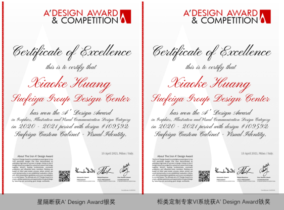日前,全球领先的国际年度设计比赛A'设计大赛(A' Design Award),公布了2020-2021年设计大赛最终获奖名单。凭借创新的设计理念和出众的产品,索菲亚星隔断产品和索菲亚柜类定制专家VI系统在本次大赛中脱颖而出,分别荣获2021 A' Design Award设计大赛银奖及铁奖。