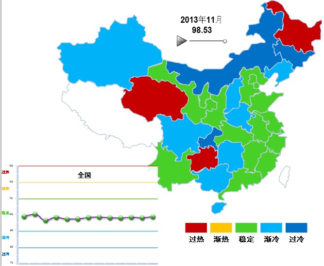 从分地区五金行业景气指数看,与10月份略有变动,青海、贵州和黑龙江三地区仍处于“过热”区;云南省由过“热区”变为了“稳定”区;内蒙、吉林、重庆三仍地区处于“过冷”区;新疆地区由“过冷”区变为了“渐冷”区;此外,河南、湖南、四川、广西和辽宁仍与10月份相同,仍处于“渐冷”区,其它大部分地区均处于“稳定”区(如图)。