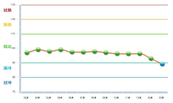 2014年2月至2014年3月工艺美术主营业务收入指数下降3.8点,呈现连续两月下降走势,现已进入渐冷运行区间。2014年3月工艺美术主营业务收入指数为89.13。(参见图3)