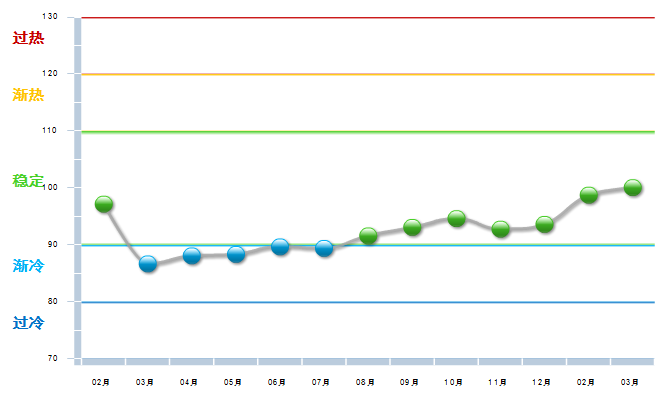 图2 2013.2----2014.3月工艺美术行业景气指数变化态势