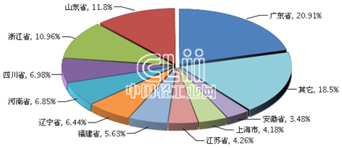 1~4月,家具行业累计主营业务收入居全国前10位的地区依次是广东、山东、浙江、四川、河南、辽宁、福建、江苏、上海及安徽,与1~3月相比,上海与江苏的名次互换,上述10个地区的累计主营业务收入合计占比达到了81.50%。广东、山东和浙江三地稳居前三甲,其中,广东的累计主营业务收入(下同)占20.91%,山东占11.80%;浙江占10.96%(图6)。