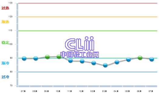 家具行业利润景气指数经过3个月的连续回升到“稳定”区间后,7月再次下跌至“渐冷”区间临近上限线,环比6月下降了1.15个百分点(图1)。