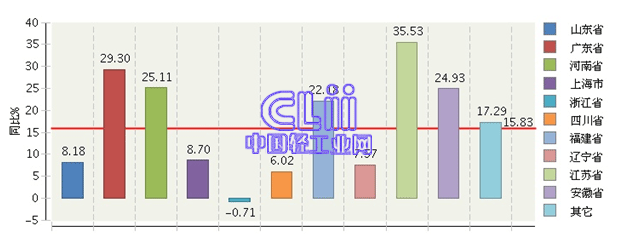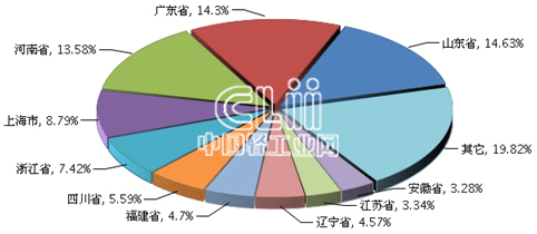 1~7月,家具行业累计利润额居全国前十位地区中出江苏超过安徽成为第九位外,前八位地区的位次与1~6月相同。其中,山东累计实现利润总额(下同)占14.63%,广东占14.30%,河南占13.58%,上海占8.79%,浙江占7.42%,四川占5.59%,福建占4.70%,辽宁占4.57%,江苏占3.34%,安徽占3.28%(图6)。