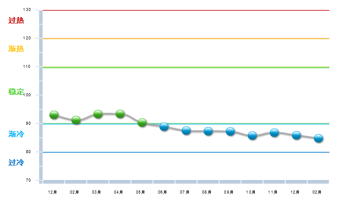 2015年12月中轻工艺美术景气指数在冲高到96.03开始回落,到15年2月已降至渐冷区域,经过几个月现仍在渐冷与稳定之间徘徊,15年7—8月运行在稳定区域的下限,10月降速加快接近渐冷区域下限,11月开始回升。(参见图2)