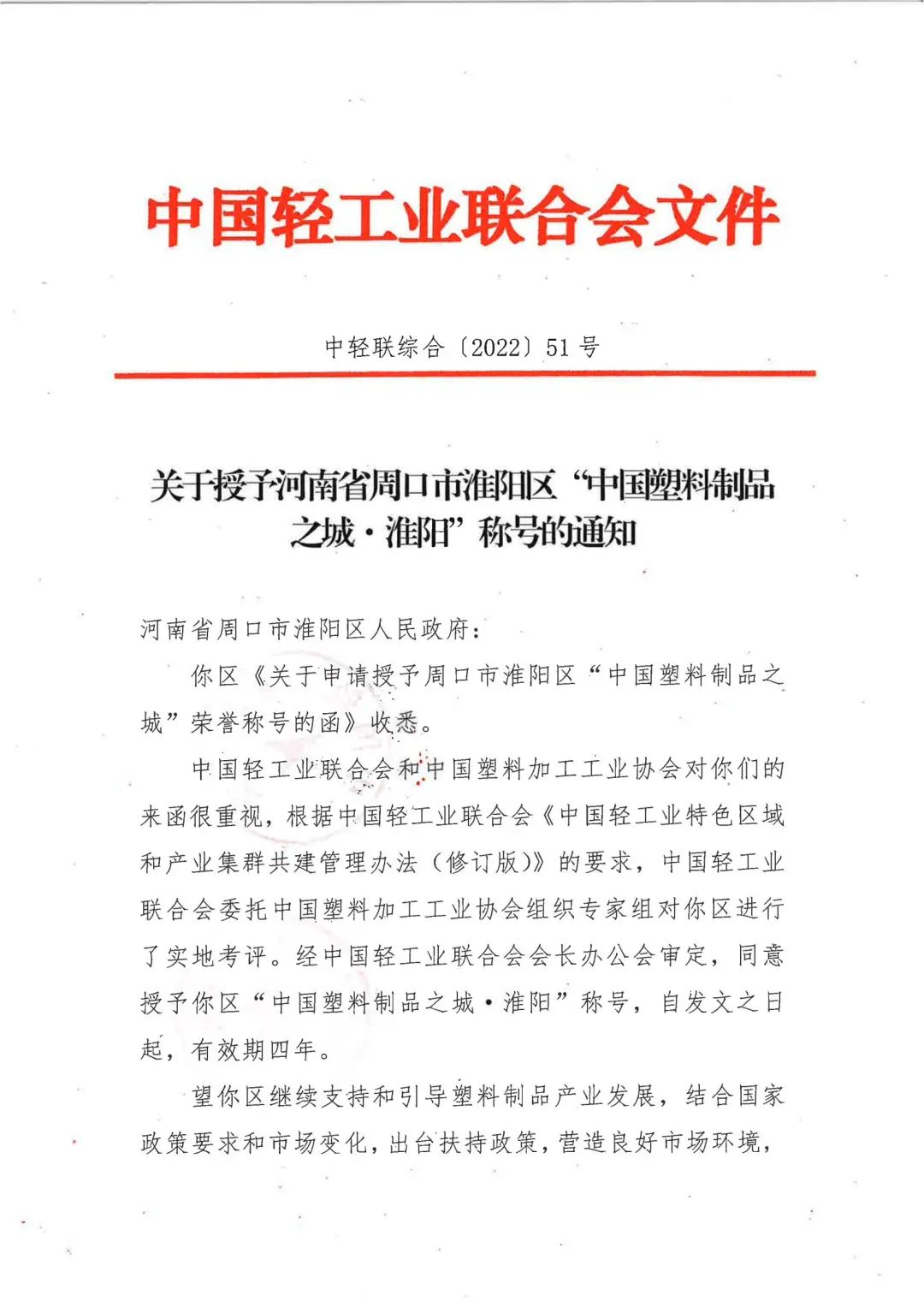 淮阳区,隶属于河南省周口市,位于河南省东南部,当地交通便利,塑料生产企业众多,具备较强发展潜力,为进一步推动当地塑料制品产业高质量发展,经淮阳区人民政府申请,由 委托中国塑料加工工业协会组织专家组实地考评,并经 会长办公会审定,同意授予河南省周口市淮阳区“中国塑料制品之城·淮阳”称号。