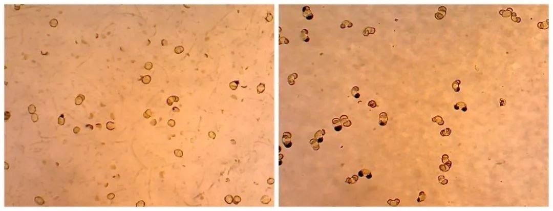 ▲实验后的松花粉:左边由破壁机搅打,右边由搅拌机搅打