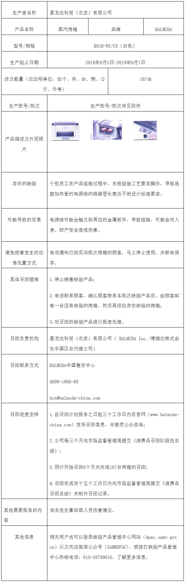 据北京市市场监督管理局网站2020年8月17日消息,星龙达科贸(北京)有限公司按照《消费品召回管理暂行规定》的要求,向北京市市场监督管理局报告了召回计划,主动召回2019年9月5日至2019年9月7日制造的蒸汽烤箱产品(规格型号:K01H-WS/CN,白色),涉及数量为167台。