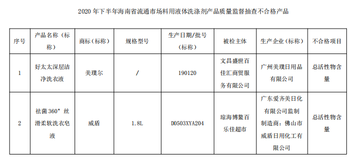 据海南省市场监管局网站2021年1月18日消息,近期,海南省市场监督管理局对全省流通市场衣料用液体洗涤剂产品进行了监督抽查。本次抽查了25批次产品,经检验,不合格8批次,不合格发现率为32%。不合格项目为:总活性物含量。