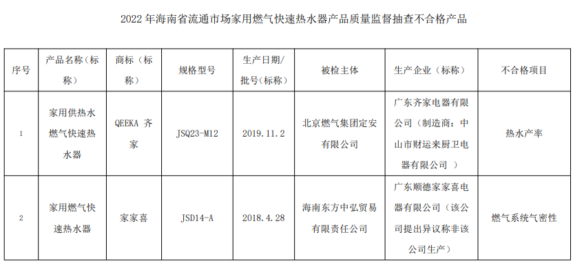 据海南省市场监督管理局网站2022年11月3日消息,近期,海南省市场监督管理局对全省流通市场家用燃气快速热水器产品进行了监督抽查。本次抽查了40批次产品,不合格2批次。