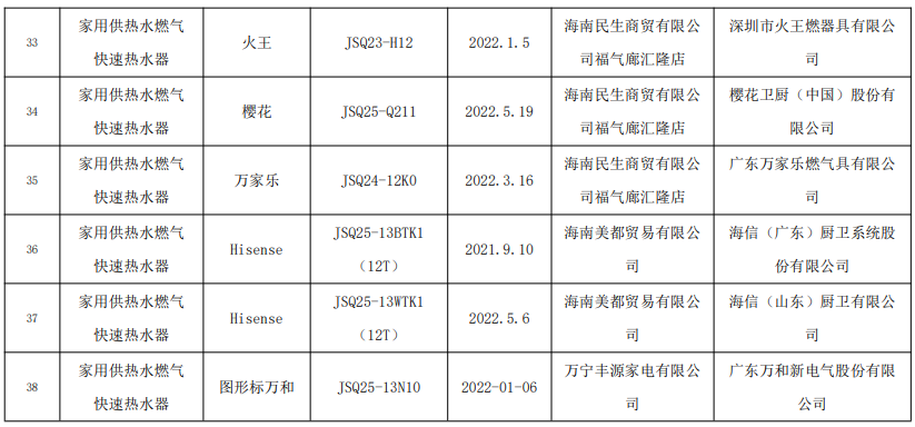 海南省市场监督管理局抽查40批次家用燃气快速热水器产品 不合格2批次