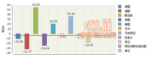 图7 2013年1~9月全国陶瓷行业累计出口额主要目的地同比增长情况