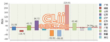2013年1~12月全国陶瓷砖累计出口额主要地区同比增长情况