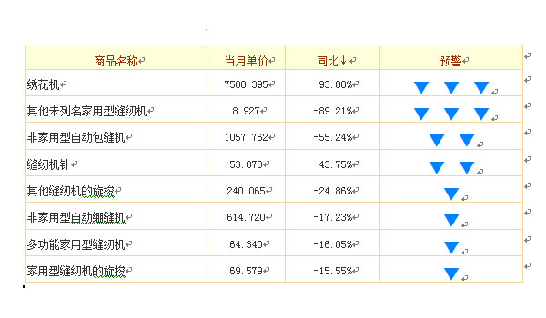 2014年12月全国缝纫机行业负增长超过10%的有8个;其中负增长在10%至30%的有4个;负增长在30%至60%以内的有2个;负增长大于60%的有2个;