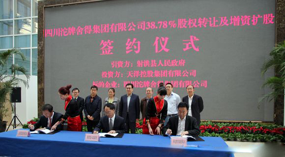 签约仪式上,射洪县委副书记、县长蒲从双、四川沱牌舍得集团董事长李家顺、天洋控股集团董事局执行董事杨宏光分别在《沱牌舍得集团股权转让及增资扩股协议》上签字,同时西南联合产权交易所董事长景平发表了鉴证意见,标志着沱牌舍得集团历经多年积极筹备的战略重组终于尘埃落定。