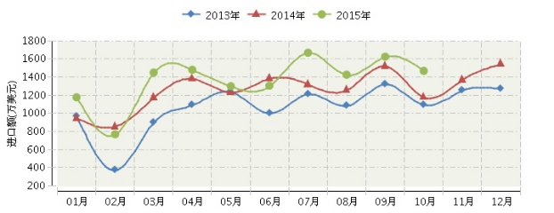 图:2013-2015年10月我国钢琴进口额月度走势对比