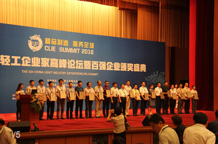 2016年6月15日上午,第五届中国轻工企业家高峰论坛暨百强企业颁奖盛典在京西宾馆隆重召开。本届论坛由 主办、 承办,会议主题是“精品制造、服务全球”。