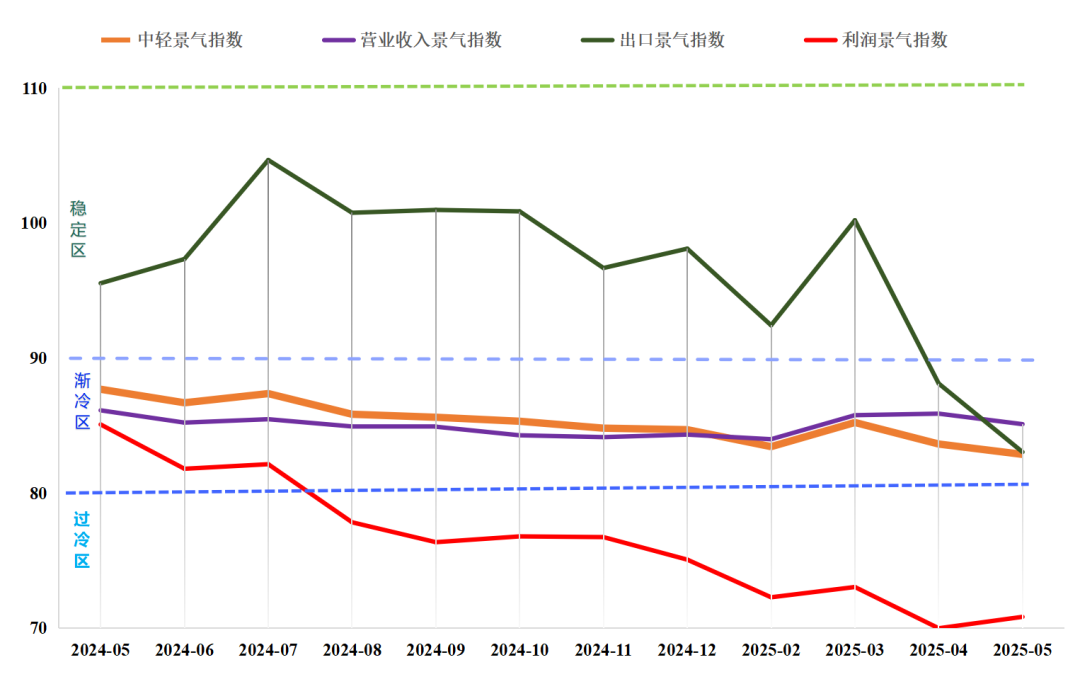 数据,5月份规上照明企业中轻景气指数、营业收入景气指数及出口景气指数均在渐冷区徘徊,分别较去年同期下降4.8%、1%、12.5%。利润景气指数一直在过冷区,较去年同期下降14.2%。