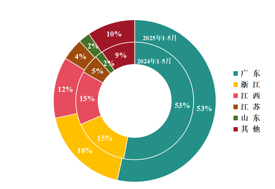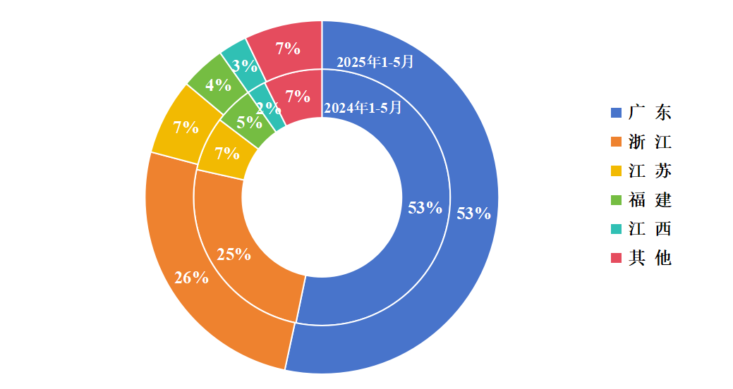 2025年1-5月规上企业照明器具制造出口交货值分地区占比