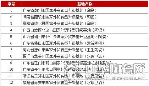 日前,国家商务部对外贸易司发布255个国家对外转型基地公示名单,陶卫行业有12个基地上榜,具体名单如下: