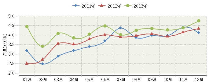 2013年全国皮革鞋靴行业连续三年月度产量对比